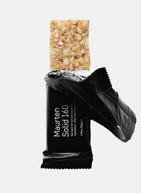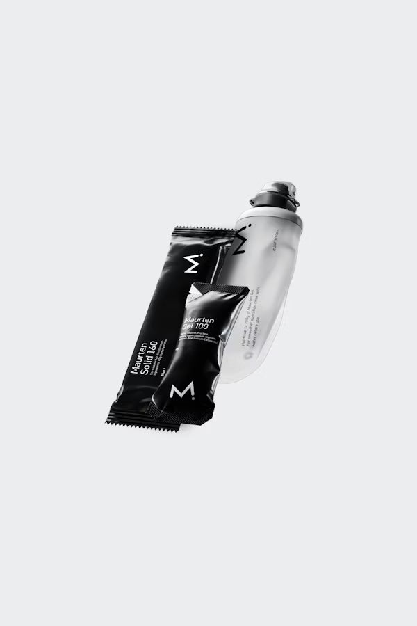 This is the Maurten Half Marathon Training Collection — a 12-week fueling solution that takes you to race day. Each pack includes: 3x boxes of Gel 100 and 1x box Solid 160. Plus a Gelflask.